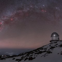 Portrait of the NOT and the Milky Way, composite of true-color and H-alpha pictures.